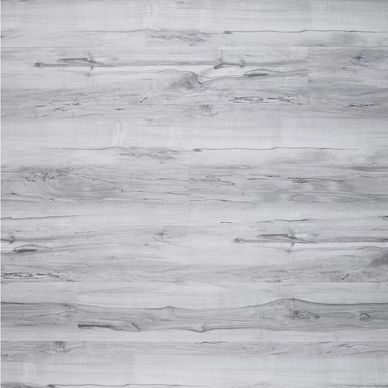 Luxury vinyl plank flooring features a white-gray wood-look finish with subtle knots and grains, offering a modern and elegant hardwood aesthetic.